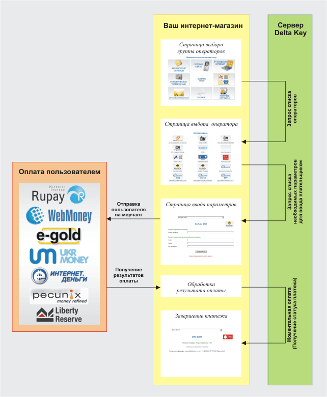 О сервисеАгентский интернет-терминал моментальной оплаты может устанавливаться в интернет-магазинах, обменных пунктах и других сервисах в качестве отдельного модуля для извлечения дополнительного дохода, либо размещаться на отдельном домене. При этом пользователи, желающие пополнить счет мобильного телефона или оплатить услуги интернет-провайдера, могут иметь счет в любой системе, подключенной к агентскому магазину для приема платежей. В качестве пользователя Delta Key или Uni Transfer должен быть зарегистрирован только владелец сервиса. В общем случае операция оплаты проходит следующим образом: