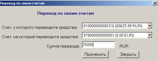Важной особенностью системы, обеспечивающей достаточную для работы гибкость и универсальность, является возможность "привязать" каждый открытый счет к какой - либо конкретной задаче, либо операции. Так, например, расход всех средств можно сделать только с одного счета, а поступления - на другой. Второй важной особенностью системы является возможность конвертации средств. Вы можете перевести средства, скажем, с рублевого счета на валютный, и обратно. Конвертация осуществляется автоматически по курсу ЦБ РФ + % коммерческого банка, осуществляющего реальную конвертацию средств.