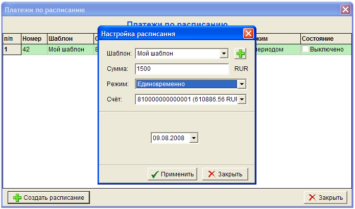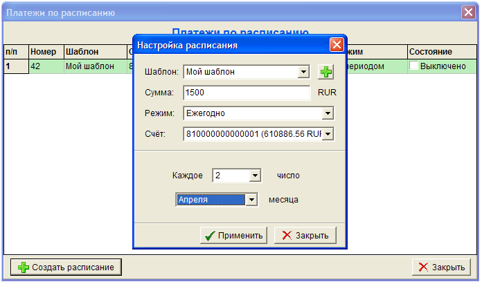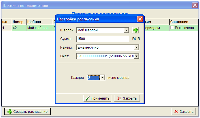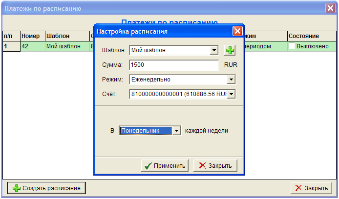 Для внесения платежа в список расписаний нужно сначала создать шаблон платежа, а затем, включив его на выполнение, задать нужное вам расписание. Сервис поддерживает несколько режимов расписания: