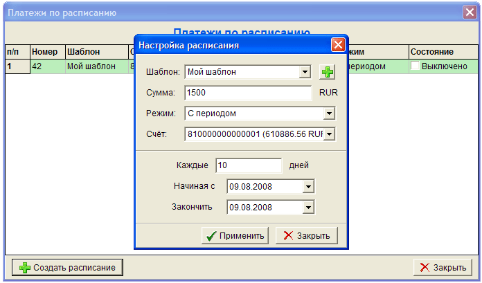 После сохранения шаблона он поступает в список ваших шаблонов платежа, после чего иго можно использовать обычным выбором из списка. Платежи по расписанию В системе работает выполнение платежей по расписанию.