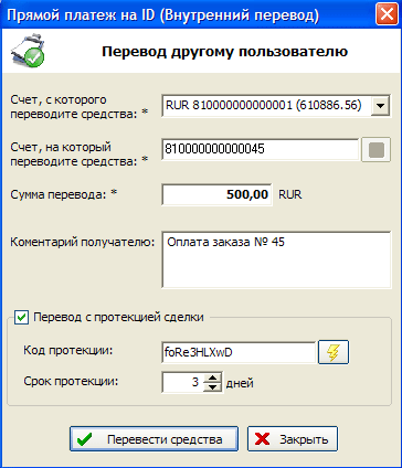 Единоразово (платеж будет произведен в заданный пользователем день). Любой платеж по расписанию можно временно отключать без потери настроек, для его активации внось - достаточно просто отметить галочкой "Включить платеж". Внутренние переводы В системе работает сервис внутренних переводов, позволяющий перевести средства другому пользователю системы.