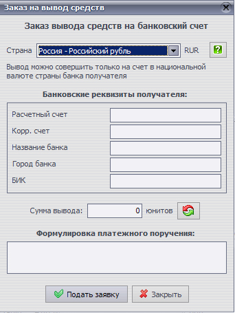 При совершении операции можно провести сделку с кодом протекции, либо без него. За осуществление операции с лица, инициировавшего операцию (плательщик), взимается комиссия системы в зависимости от условий используемого участником тарифного плана. Электронные чеки Электронные чеки существуют исключительно в электронном виде. Электронные чеки могут быть переданы другому пользователю системы и использованы в оплату товаров и услуг. Каждый пользователь нашей платежной системы может выпускать электронные чеки. Выпуск данных карт производится в пункте меню "Электронные чеки". В момент ее выпуска с пользователя удерживается номинальная (заданная им) стоимость карты в заданной валюте. Комиссия системы удерживается в соответствии с тарифами системы. Далее пользователь может как угодно распоряжаться выпущенной им электронной картой - например, передать ее другому пользователю системы, подарить, продать на торговой площадке, и так далее. При активации карты на счет нового владельца будет зачислена сумма, равная номиналу карты. Комиссию при активации электронной карты система не взимает. Для пользователей создан ряд механизмов, делающих работу с электронными чеками более комфортной - проверка действительности карты, аннулирование, просмотр выпущенных карт. Банковские переводы Вывод средств из системы в банк - очень распространенный сервис. Система поддерживает вывод по банковским реквизитам во всех своих программных продуктах.