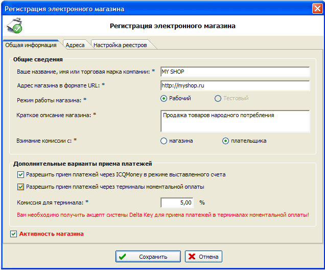 В открывшейся форме регистрации электронного магазина Вам необходимо заполнить все три вкладки: - Общая информация - Адреса - Настройка реестров Во вкладке общей информации необходимо указать общие параметры магазина, режим работы (тестовый или рабочий), с кого взимается комиссия, а также разрешить или запретить дополнительные опции.