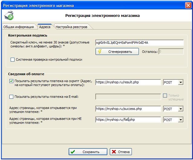 Во вкладке "Адреса" укажите правильные URL-адреса, на которые система отправит результат оплаты, а также перенаправит плательщика по завершении операции.