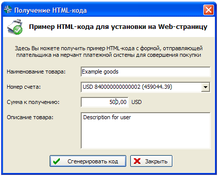 Для Вашего удобства программа автоматически сгенерирует пример рабочего HTML-кода, который нужно вставить в страницы вашего сайта для работы с нашей системой. Вернуться назад |