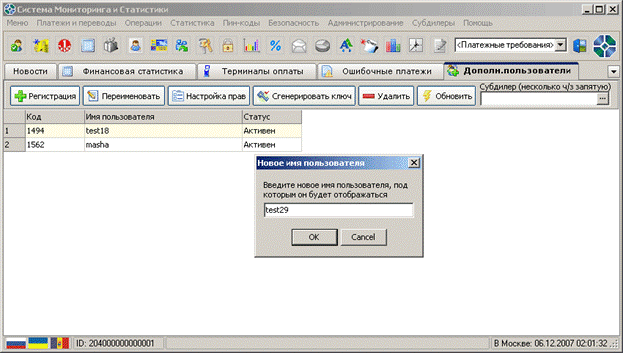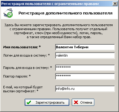 / Регистрация Регистрация дополнительных пользователейРегистрация дополнительных пользователей позволяет регистрировать в системе персон с ограниченным набором прав. Например, владелец сети терминалов может зарегистрировать в системе технического специалиста, который сможет регистрировать точки, менять их настройки, контролировать статистику прохождения платежей, но не сможет проводить какие бы то ни было финансовые операции; можно зарегистрировать дополнительного пользователя-кассира, у которого не будет возможности выполнить перевод другому пользователю системы или изменить настройки безопасности и т.д. Каждого такого дополнительного пользователя с ограниченным набором прав необходимо зарегистрировать, настроить его права и сгенерировать ему отдельный ключ, с которым он сможет авторизовываться в СМС. Регистрация нового дополнительного пользователя Просмотр списка пользователей Переименование пользователя Настройка прав Генерация ключа Удаление дополнительного пользователя Регистрация нового дополнительного пользователяДля регистрации дополнительного пользователя с ограниченными правами необходимо выбрать пункт меню <Меню> - <Регистрация дополнительных пользователей> - <Добавить нового>. В результате будет открыто окно, в котором необходимо заполнить соответствующие данные: