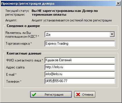После нажатия кнопки "Регистрация" Ваши данные поступят в систему на обработку. Однако все возможности, предоставляемые дилеру, вступают в силу только после акцепта системы. В большинстве случаев для получения акцепта необходимо подписать договор с платежной системой (например, "Договор о приеме платежей" для дилеров по терминалам оплаты). |