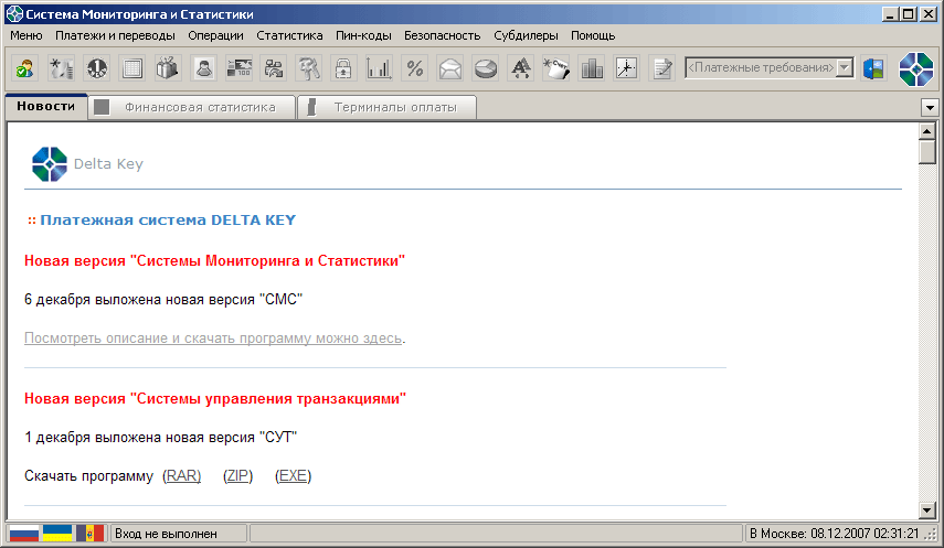 / Регистрация Регистрация в системеПосле выполнения установки программы для осуществления каких-либо действий с программой необходимо быть зарегистрированным пользователем платежной системы "Дельта Кей", а также иметь ключ, логин и пароль к программе. Если Вы никогда не были зарегистрированы ни в одном продукте системы, то необходимо выполнить новую регистрацию. Если у Вас есть ключ, логин и пароль к ПО "Система Управления Транзакциями", то с этим же ключом, логином и паролем Вы можете авторизоваться в СМС. Если Вы ранее регистрировались в Uni Transfer, то достаточно будет подтвердить регистрацию в СМС для получения ключа главного пользователя.