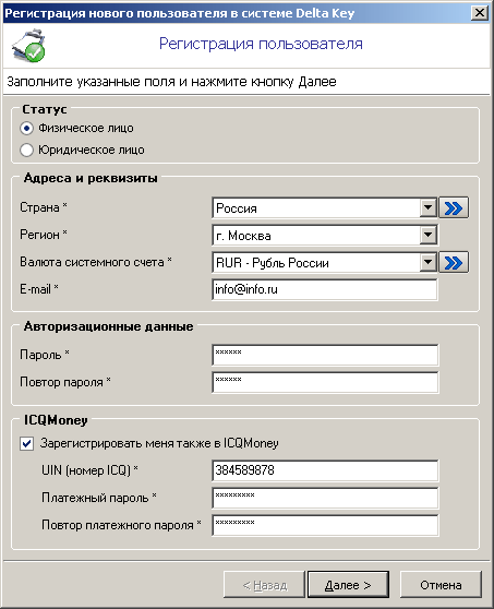 Далее выполните в меню пункт "Меню" - "Регистрация нового пользователя". Откроется окно: