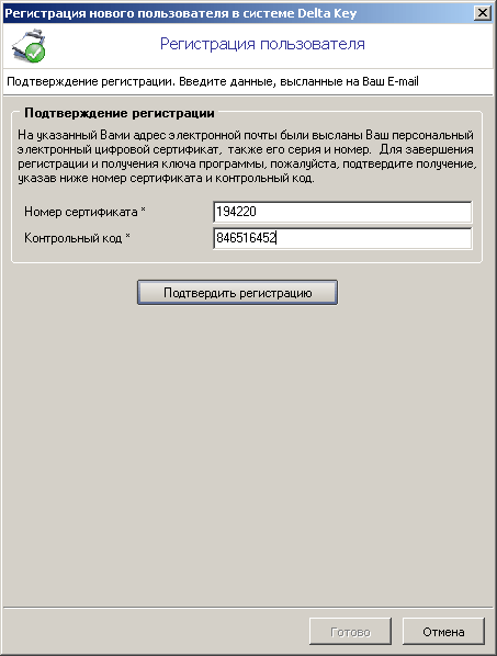 После ввода данных нажмите кнопку "Подтвердить регистрацию". После этого программа предложит сохранить файл ключа.