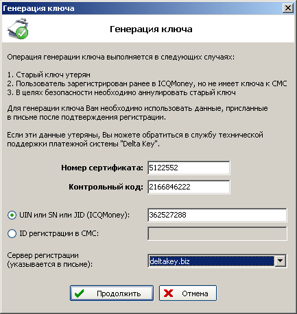 Вы можете сохранить ключ на сменном носителе, например на флеш-карте, дискете, либо на локальном диске. Ключ не должен располагаться на CD или DVD-дисках, т.е. на таких носителях, куда разрешен доступ только на чтение. Используя этот ключ, а также данные - логин, полученный по почте, и пароль, указанный Вами в начале регистрации, Вы сможете выполнить вход в программу. Логин, высланный на почту, генерируется как случайная последовательность цифр и букв, и не очень удобен в запоминании. Авторизовавшись в программе с этими данными, Вы сможете впоследствии его сменить. 1.1.2. Подтверждение регистрации Uni Transfer.Если Вы ранее были зарегистрированы в Uni Transfer, то выполнять новую регистрацию не имеет смысла, так как можно подтвердить имеющуюся регистрацию. Для подтверждения регистрации откройте программу с помощью ярлыка на рабочем столе или через меню "Пуск" - "Программы" - "Delta Key" - "CMC v.X.X.X". Выберите пункт меню "Меню" - "Генерация ключа (Uni Transfer)".